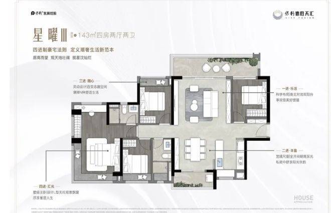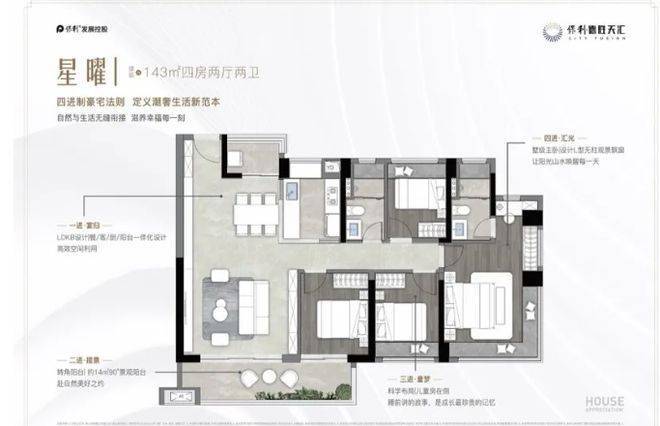 在空间尺度上更加阔绰,客厅、餐厅与阳台一体化设计,形成宽敞通透的公共空间,营造出大气的居住氛围。四房格局,满足三代同堂或二孩家庭的居住需求。主卧空间开阔,配备大尺寸飘窗,可欣赏窗外美景,独立衣帽间与卫生间,彰显主人尊贵身份。次卧同样注重空间感与舒适性,每个房间都能保证良好的采光和通风。此外,该户型的阳台拥有更大的进深和长度,为业主提供更多的休闲可能性,如打造空中花园等。