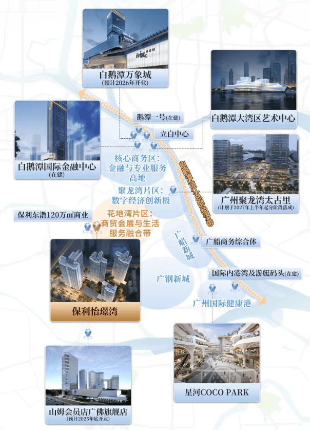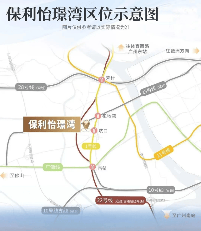 引用《广州市城市总体规划(2025版)》,明确指出荔湾花地湾板块被定位为城市副中心,承担着商业、居住、文化等多重功能。红利兑现时间表上,未来1 - 2年内将动工的配套众多。距离项目直线距离300米的地铁1号线花地湾站已运营,未来规划中的地铁25号线(规划中)花地湾西站将设于项目南侧,建成后3站直达广州南站。教育方面,项目旁边规划引入的省一级公立康有为纪念小学,由保利置业斥资2亿元建设,预计2025年9月正式开学,距离项目仅300米。商业上,项目下楼即为社区商业,700米范围内规划18万㎡理想花地商业,2.2公里处有广州聚龙湾太古里(预计2027年开业),2.5公里处将迎来广州首座万象城(预计2026年开业)。