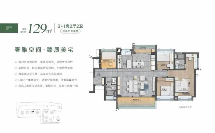 105㎡起的户型开始注重动静分区与私密性。以129㎡为例: