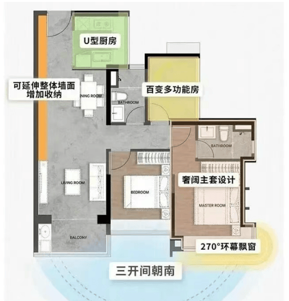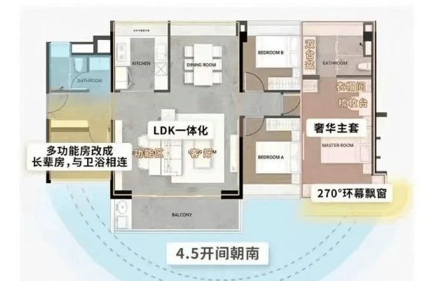 96㎡户型:东南向或西南向,配备7.6米³整墙收纳、5平方米全景厨房以及270°景观主卧套间。