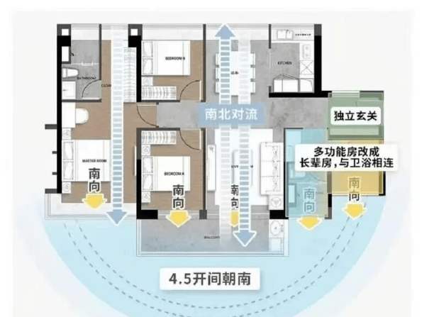 123㎡户型:南北对流主卧套房、金融岛唯一阳光玄关、4.5开间朝南,可改造成双套间。