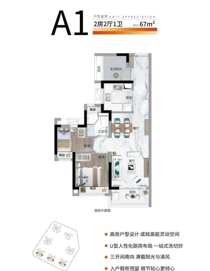 67平方米两房:空间实用率高,适合年轻家庭或首次置业者。