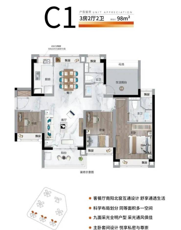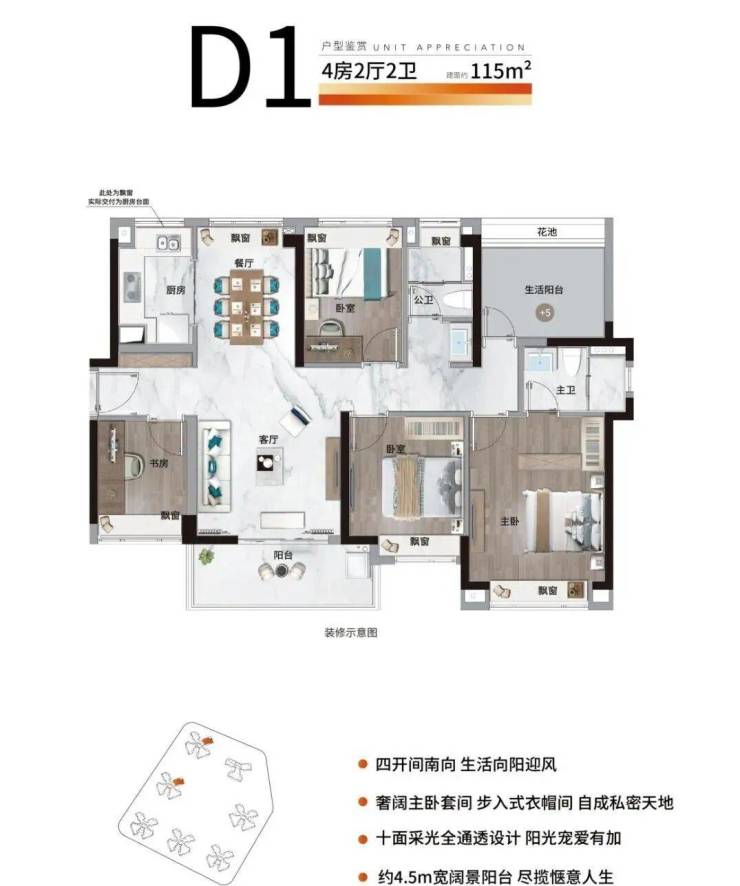115平方米四房:空间宽敞,适合多人口家庭,主卧套房设计,提升居住舒适度。