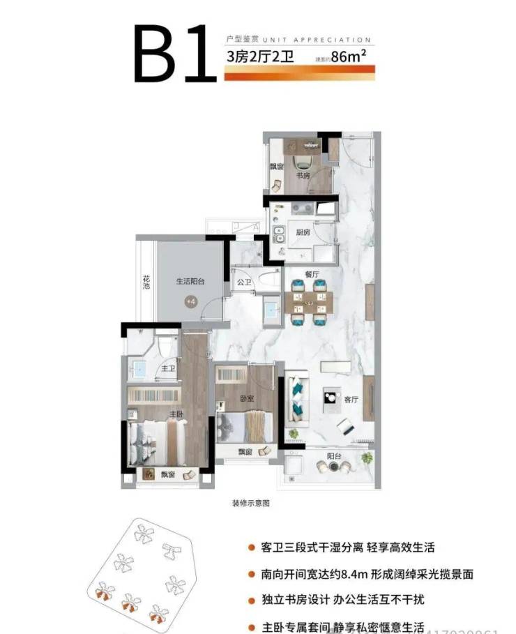 86平方米三房:南北通透,采光通风俱佳,适合三口之家。