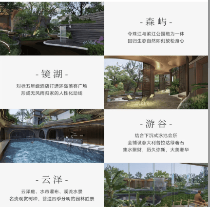 项目的社区园林同样极具特色,由蓝调国际大师主笔,以“溯源”广州在地文化为设计理念,以珠江为源头,溯流而上,从外到内匠心打造“森屿、镜湖、游谷、云泽”四重景观礼序,塑造优雅归家动线,让业主从踏入社区的那一刻起,就能感受到自然的静谧与尊崇。园林设计高度自然化,融入了岭南地域文化元素,搭配水景、景观小品、休闲座椅等设施,打造了“一步一景、步移景异”的园林体验,每一处景观都经过精心打磨,与三江江景遥相呼应,形成“江景入园、园藏江色”的独特景观格局。