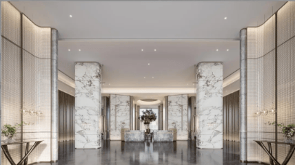 细节处理与交付标准,更是体现了项目的空间巧思与顶豪定位,堪称“天花板级”交楼标准。在交付标准上,项目精选鱼肚白、普拉达绿、古堡灰等豪宅御用天然奢石,采用五星级宝格丽酒店、洲际酒店等同款用材,提升整体空间质感,彰显高贵气场;全屋采用德国嘉格纳、高仪,瑞士劳芬等国际一线品牌交标,重新定义奢宅装标,完美匹配塔尖人士的品质需求。此外,户型内的细节处理也极为考究,入户门采用厚重的高端入户门,搭配智能门锁,彰显身份与安全;室内地面通铺大面积高端地砖,采用极简美缝工艺,打扫起来简单便捷,没有藏灰的缝隙;主卧配备全景飘窗,既拓展了空间,又能让业主欣赏江景,提升居住体验;卫生间配备双台盆、智能马桶、恒温花洒等,彰显人性化关怀,让每一位业主都能享受顶豪级的居住体验。