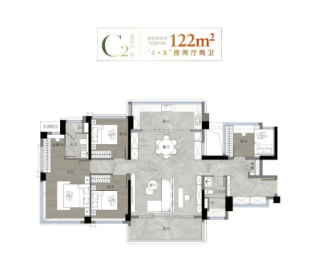 122㎡四房两厅三卫:作为改善主力户型,实测套内面积约 146.4㎡,南向面宽达 15.8 米;双主卧设计均带独立卫浴,客厅连接 6.8 米阔景阳台,可直面南向江景与社区园林,全屋配备中央空调与新风系统,交付标准对标高端改善需求。