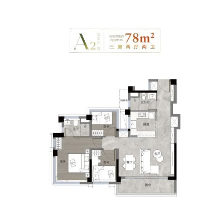 78㎡三房两厅一卫:实测套内面积约 93.6㎡,四开间朝南,南向面宽达 11.2 米;客厅连接观景阳台,主卧带飘窗拓展空间,实测拓展面积约 2.8㎡,可优化为收纳区,满足刚需家庭空间需求。