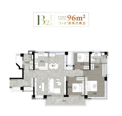 96㎡四房两厅两卫:实测套内面积约 115.2㎡,南北对流设计,南向面宽达 13.5 米;LDKB 一体化客餐厅面积超 25㎡,配备 U 型厨房与独立玄关,主卧带步入式衣帽间,空间利用率拉满。