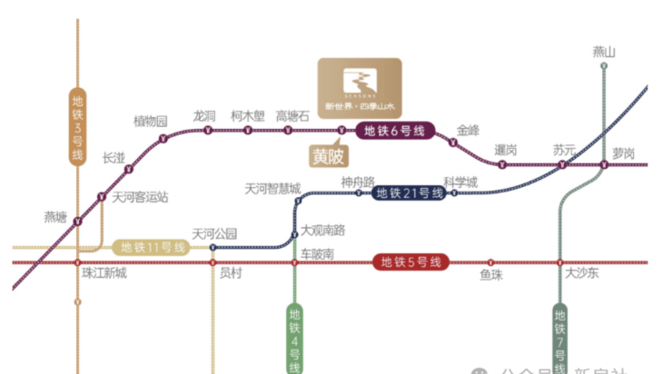新世界四季山水项目紧邻黄陂地铁站,直线距离仅约20米,实现无缝地铁入户,极大方便居民日常通勤和出行。项目所在区域交通网络完善,除地铁外,还紧邻广汕公路,通过广园快速、广佛肇高速及周边主干道构成“五横三纵”立体路网,可快速通达市区核心商圈及周边城市,出行选择丰富且高效。