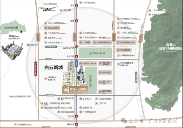 粤海·云港城的位置,正好处于这条中轴线的黄金节点。向北,可以直达白云山风景区,享受自然的馈赠;向南,可以迅速接入主城区路网,通达全城;向东,紧邻白云国际会议中心等六大省市级地标建筑;向西,则是南航三大总部、无限极总部等企业总部大楼。这种“众星拱月”的区位格局,使得项目成为了白云新城当之无愧的“皇冠明珠”。