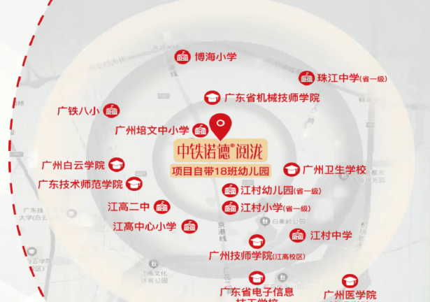 项目自建18班公立华师品牌幼儿园已开园,并引入国际化培文中小学,实现全龄教育覆盖。对于小学学位,有35%作为公办学位供白云区统一安排;中学学位则有10%作为公办学位。此外,周边还有江村小学、广州铁路第八小学以及省一级的广州市六十五中学(江府校区)等教育资源。
