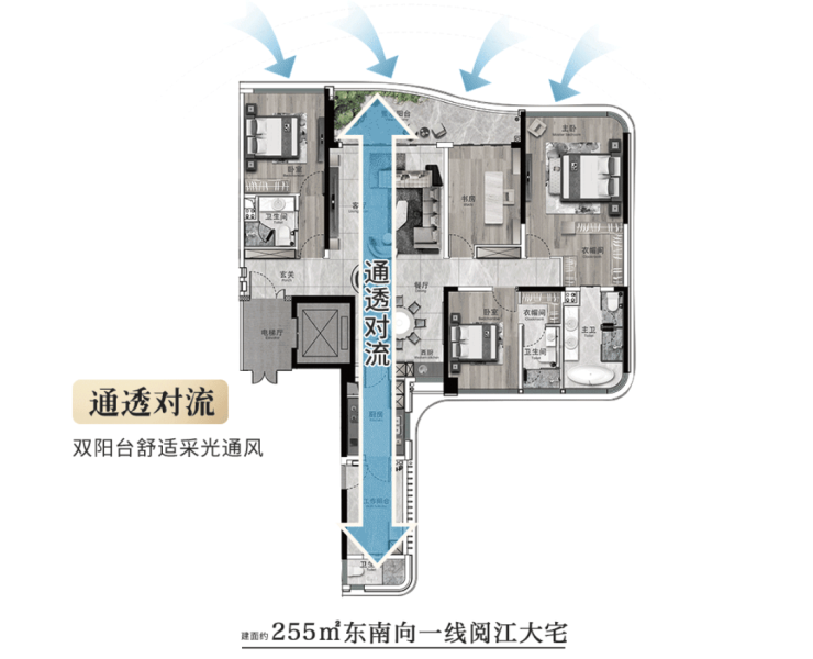 广州幸福湾住宅采用板式结构,户型一字排开,大面宽设计,确保无遮挡采光和通风对流。项目主力户型包括255平方米、233平方米、335平方米和504平方米的四房设计,以及139平方米和191平方米的三至四房选择,充分满足不同家庭需求。东南向设计不仅保证夏季避直晒,冬季享长采光,同时结合270°圆弧景观阳台和三层中空LOW-E夹胶玻璃,实现隔音、保温与舒适性兼具。户型空间布局合理,南北双阳台设计改善空气流通,为健康居住提供最佳条件。每一户均兼顾景观、私密与功能性,打造高端健康生活体验。
