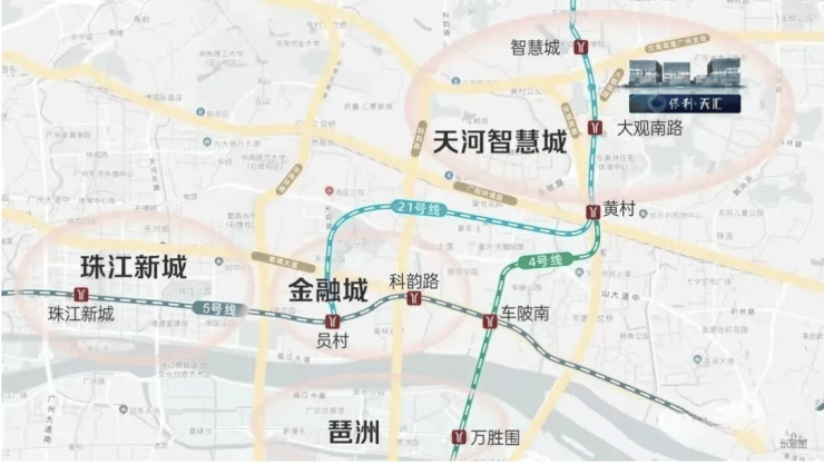 项目位于天河智谷板块,交通便利。距离21号线大观南路站约1.2公里,步行约20分钟,可换乘4号线直达金融城、琶洲,并4站到员村换乘5号线直达珠江新城。自驾出行可通过广深高速、广园快速路、大观路及在建的机场第二高速,40分钟内可到达各区中心。