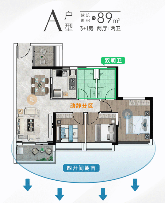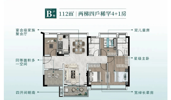在售 89㎡四房二卫与 112㎡五房二卫户型,均实现四开间朝南,采光通风俱佳。89㎡户型采用动静分区设计,U 字型厨房优化操作动线,双明卫实现干湿分离;112㎡户型打造轩敞客餐厅,南北对流提升空间舒适度,阔景阳台延伸视野,多一室空间可灵活改造为书房或儿童房,充分契合刚需过渡与改善升级的双重需求。