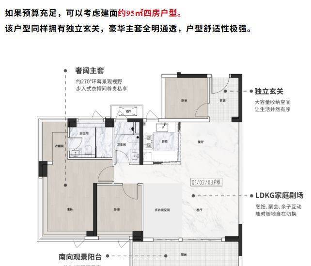 户型设计独具匠心,得房率超高。主推建面约 75 - 108㎡全南向三至四房,最高使用率 120% 。75㎡三房户型,独立玄关可改储藏室,U 型厨房操作空间大,主套 270° 环幕视野。95㎡四房户型,LDKG 一体化设计,6.4 米超大阳台。108㎡四房户型,约 15 米南向超大面宽,7.2 米南向阔景阳台,主卧带步入式衣帽间。每个户型都充分利用空间,满足不同家庭需求。