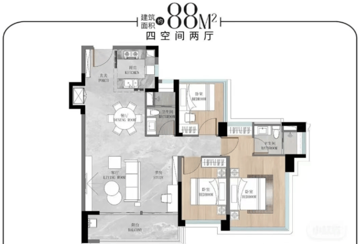 88㎡3+1房:LDKB一体化布局,四开间朝南,总价约450万起。