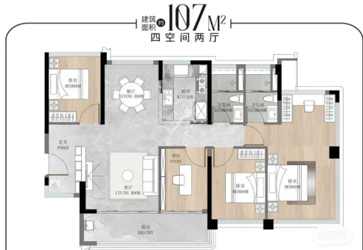 106㎡四房:南北通透双轴线,独立玄关,主卧套房+270°转角飘窗。