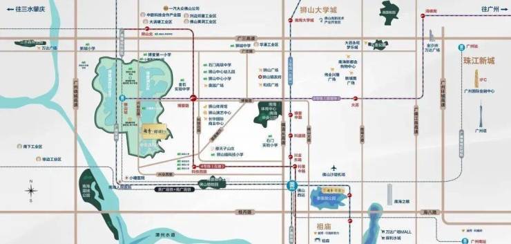 交通方面,项目距离地铁4号线、8号线(规划中)博爱湖站约800米,步行可达;距城轨狮山站约900米,佛山西站约6公里,高铁20分钟直达广州南站。配合“四横三纵”主干路网,轻松融入广佛1小时生活圈。