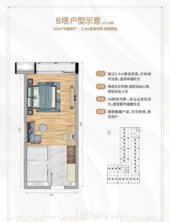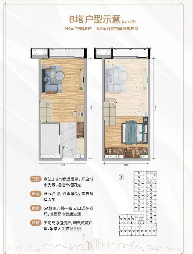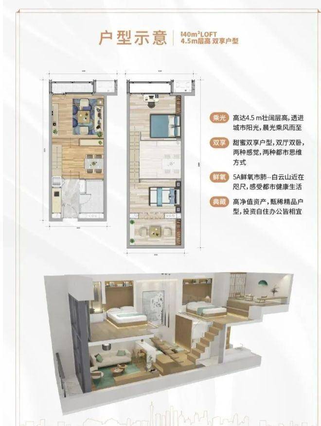 31 - 57㎡中轴资产:4.5 米层高魔方空间,创新 LOFT 中空挑高,功能复合型立体布局,卧室、厨房、卫浴全能配置。31㎡能量舱,为城市精英提供充电空间;45㎡梦想家,打造全能生活实验室;57㎡天际阁,带来墅级空间体验。以珠江新城 1/3 价格享中轴资产,买一层得两层,还有 U 型厨房、步入式衣帽间配置。