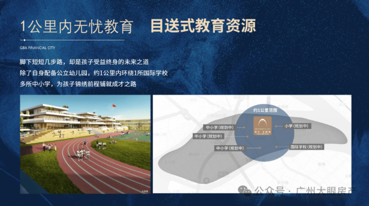 对于家庭置业而言,教育资源的质与量是重中之重。湾区金融城自身规划配建了包括托儿所、幼儿园在内的完整基础教育体系。更值得关注的是,项目西侧规划有一所54个班的九年一贯制学校,且项目周边还环绕着广州市湾区实验学校、广州大学附属中学南沙实验学校等5所优质学校,形成了浓厚的书香氛围。