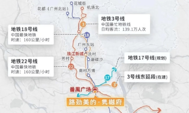 18号线:时速160公里,直达珠江新城、琶洲,全程无需换乘,最快20分钟内通达广州CBD;