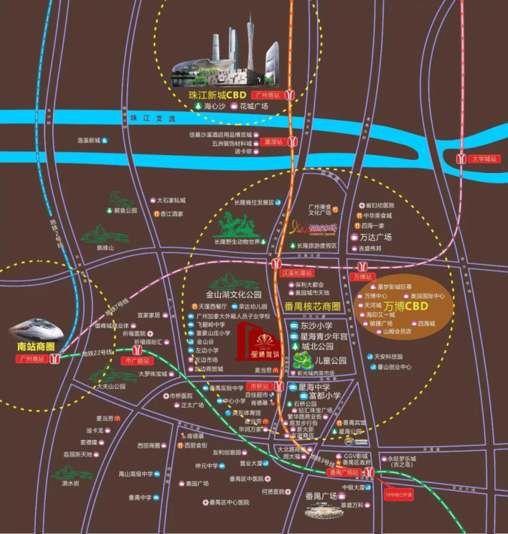 星誉·星晴雅筑地处南大干线、新光快速、番禺大道等城市动脉组成的“五纵五横立体交通网”黄金十字中轴之上,1小时内即可畅达粤港澳大湾区的核心区域。项目距离地铁3号线市桥站仅1.4公里,不需换乘即可直达珠江新城,实现广州主城、番禺核心商圈、佛山及南沙湾区之间的无缝切换。