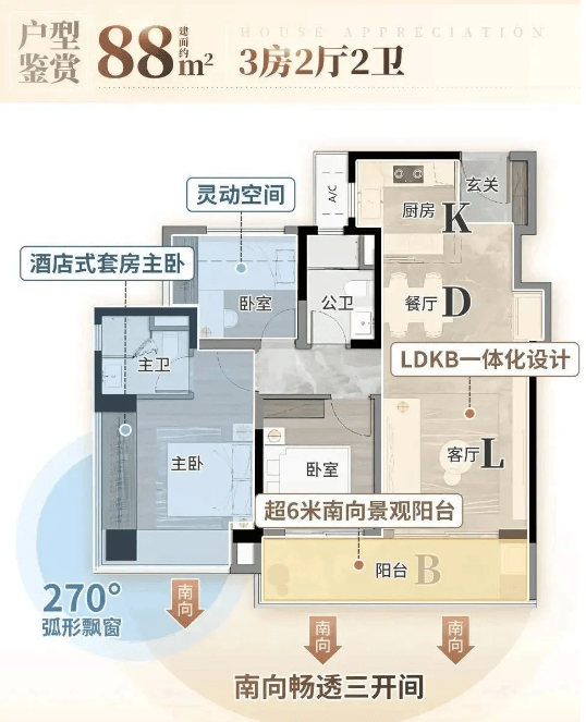 建面约87㎡三房两卫:户型升级优化,空间更开阔,大面宽、短进深的设计让采光效果最大化。客厅与餐厅相连,形成通透的公共活动空间,阳台长度延伸至次卧,晾晒与观景互不干扰。主卧套房设计,配备步入式衣帽间与独立卫生间,提升居住品质;次卧均带飘窗,增加空间收纳与观景功能。