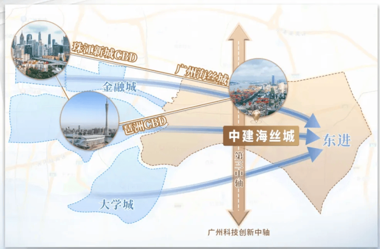 中建海丝城坐落于广州海丝城核心板块,地处临港经济片区,是广州市沿江东进发展战略的重要节点,更是黄埔“三城一岛”战略的核心承载区,与珠江新城、琶洲形成“黄金三角”格局,占据不可替代的战略性中间区位,享受多重政策红利加持。