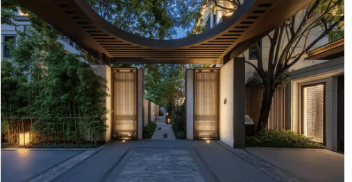 中冶逸璟公馆总规模虽小(48 户),但社区规划尽显高端与私密:项目采用围合式新中式院落布局,建筑风格淡雅含蓄,汲取广府文化精髓与皇家院落规制,通过威仪府门、镇宅石狮、名园造景等元素,还原中式千年人居理想。社区整体抬高约 6 米,退让人行道红线约 10 米,与宝岗大道隔开,有效隔离粉尘与噪音,营造安静、私密的内部环境。