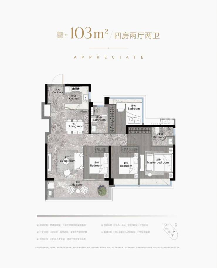 103㎡四房:南向四开间、12米采光面、主卧套房带飘窗,实际使用面积超130㎡,总价525万起,适合首改家庭。