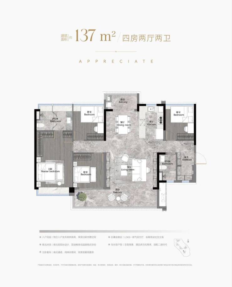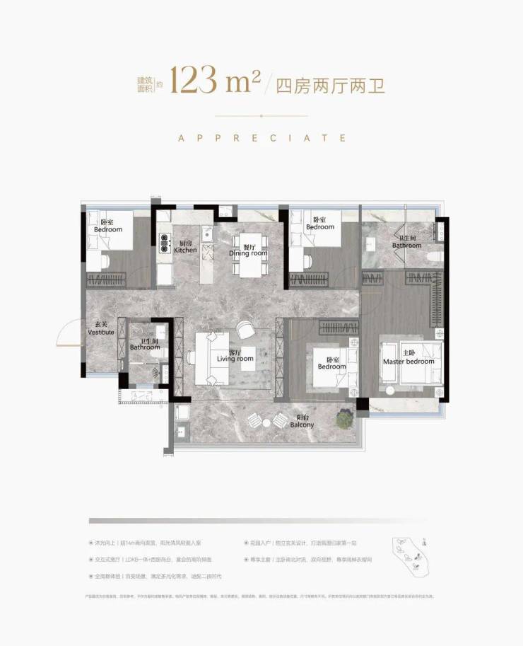 125㎡四房:双主卧+7米阳台,总价620万起,满足二胎家庭需求。