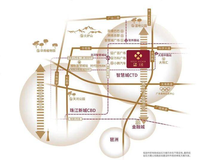 从城市交通格局来看,广州城投天禧拥有极其优越的立体交通网络。项目距离已开通运营的地铁21号线天河智慧城站约800米,同时周边还规划有多条轨道交通线路形成多维交通枢纽结构。10号线二期软件路站以及29号线大观中路站均在规划建设中,未来可实现更高效的跨区域通勤。东环城际铁路智慧城站也在建设推进中,未来可直接连接广州主要交通门户,如广州白云国际机场及广州南站等交通枢纽。自驾出行方面,项目周边形成四横四纵快速路交通体系,广汕公路、华观路、大观路等城市主干道串联城市东西南北方向。华南快速路、科韵路及广园快速路则大幅提升城市通勤效率。公共交通方面,小区周边规划有公交首末站,形成多层次交通接驳体系,使居民日常通勤及跨城出行均较为便捷。
