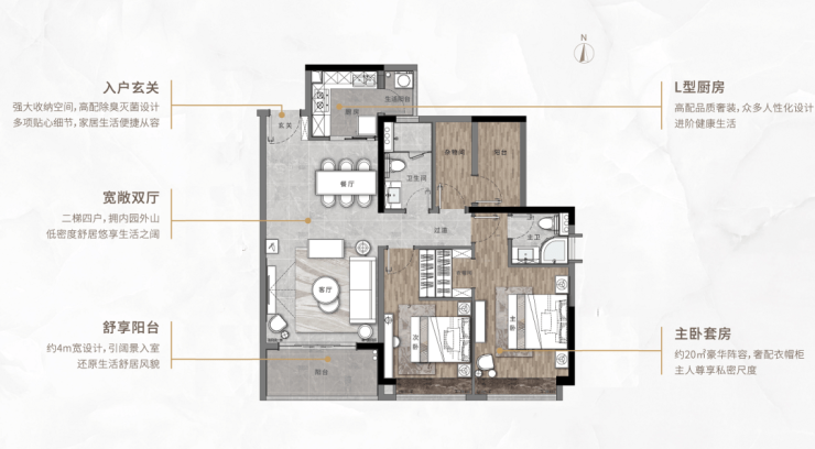 山园双重景致:作为板块内唯一正南北横厅户型,客厅宽敞大气,饭客厅连成一体;双阳台南北对流,6.5米超宽景观阳台,尽享大夫山与园林中轴的双重美景。
