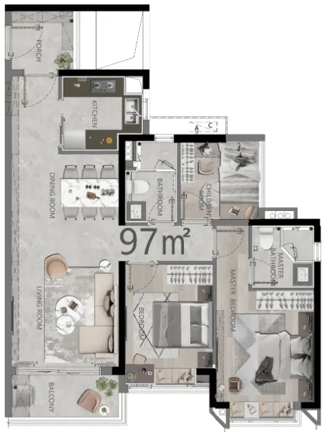 加粗 1. 97㎡三房两厅两卫:刚需首套的完美选择