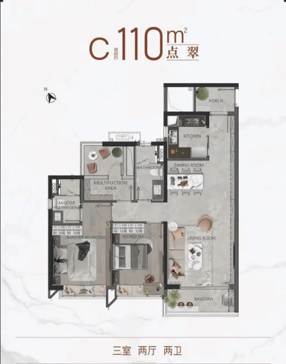 加粗 2. 110㎡三房两厅两卫:二胎家庭的舒适之选