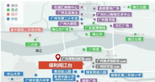 保利阅江台地处广州海珠区滨江东核心区域,地理位置得天独厚,具体位置位于广州大道西边,西侧是滨江水恋,北侧是珠江新岸公寓,北邻珠江、东眺广州塔、对望珠江新城和二沙岛,属于广州传统豪宅板块,周边居住氛围成熟,人文气息浓厚,是高端人群居住的优选之地。