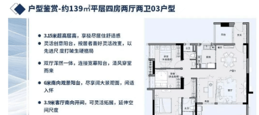 二、139㎡四房两厅两卫(低区西南向):该户型为低区舒适型四房,面积适中,采光通风优越,西南向可享受充足阳光,同时可欣赏部分江景,总价区间贴合中端改善客户需求。户型布局:入户玄关宽敞,可设置玄关柜,收纳空间充足;客厅与餐厅相连,形成开阔的活动空间,客厅连接南向阳台,西南向采光充足,阳光可直接照射进室内,提升居住舒适度;厨房为L型设计,操作便捷,与餐厅相邻,动线合理;四个卧室均配备飘窗,其中两个卧室朝南,采光通风良好,主卧为套间设计,配备独立卫生间与衣帽间,空间宽敞,舒适度高;公共卫生间干湿分离,设计合理,方便家人使用;整体户型方正,动静分离,空间利用率高,无浪费面积。特色设计:西南向采光,阳光充足,居住舒适度高;客厅与餐厅通透设计,空间开阔,适合家庭聚会;主卧套间配备衣帽间,收纳空间充足,满足高端改善需求。