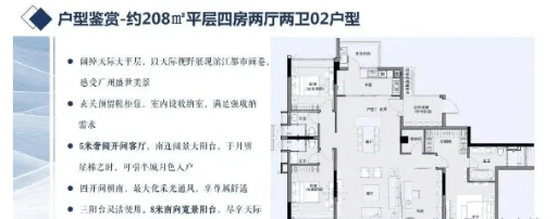 四、208㎡四房两厅三卫(高区大平层):该户型为高区稀缺大平层四房,2梯2户设计,私密性极强,推窗即可直望珠江新城、广州塔,江景视野绝佳,总价1900万起,适合高端改善型客户、大家庭居住,彰显圈层身份。户型布局:入户设有独立玄关,大气宽敞,配备玄关柜,收纳空间充足,提升入户仪式感;客厅为横厅设计,空间极致开阔,连接超大观景阳台,阳台直面珠江,可全方位欣赏珠江美景、广州塔与珠江新城天际线,景观视野无敌;餐厅与客厅相连,形成超大活动空间,可容纳多人聚会、宴请宾客,彰显高端品质;厨房为中西双厨设计,满足不同烹饪需求,配备生活阳台,方便杂物收纳与通风;四个卧室均为豪华套房设计,每个卧室都配备独立卫生间与飘窗,其中主卧空间超大,配备步入式衣帽间、独立卫生间与超大观景飘窗,可欣赏一线江景,保障主人的隐私与舒适度;书房可灵活改造,可作为办公区、休闲区或儿童房,满足多元化居住需求;整体户型方正,南北通透,采光通风极佳,动静分离,空间利用率高,每一个空间都兼顾实用性与舒适度。特色设计:2梯2户专属配置,私密性强,上下楼便捷;横厅设计+超大观景阳台,一线江景视野,景观体验绝佳;中西双厨设计,满足高端居住需求;全套房设计,每一位家人都能拥有独立的私密空间;可灵活改造的书房,贴合多元化居住需求。