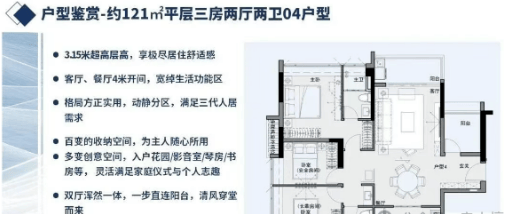 一、121㎡四房两厅两卫(低区北向):该户型为低区主力小面积四房,面积适中,布局紧凑合理,适合三口之家或四口之家居住,性价比突出,总价910万起。户型布局:入户设有玄关,预留鞋柜位置,保障入户私密性;客厅连接阳台,北向视野开阔,可远眺江景与城市景观,客厅空间宽敞,可满足家庭聚会、休闲娱乐等需求;餐厅与厨房相邻,厨房为U型设计,操作空间充足,动线合理,方便烹饪与用餐;四个卧室分布合理,均配备飘窗,采光通风良好,主卧为套间设计,配备独立卫生间与衣帽间,保障主人隐私,提升居住舒适度;两个公共卫生间,分布在户型两侧,方便家人使用,避免拥挤;整体户型动静分离,休息区与活动区分开,互不干扰,提升居住体验。特色设计:北向观景阳台,可欣赏珠江远景与城市风光,闲暇时可在阳台观景、品茶;U型厨房设计,最大化利用空间,操作便捷;主卧套间设计,兼顾私密性与舒适度,满足改善型需求。
