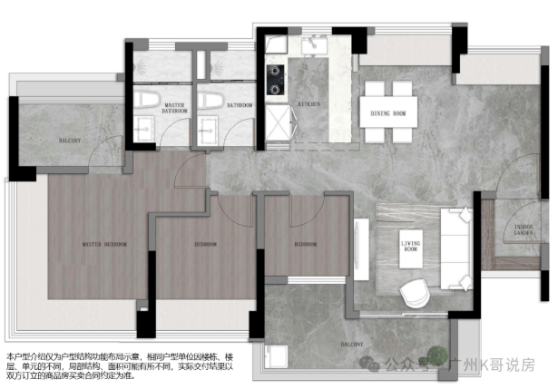 75㎡三房两卫:四开间朝南,全明转角玄关,开放式厨房,南北对流主套及衣帽间。