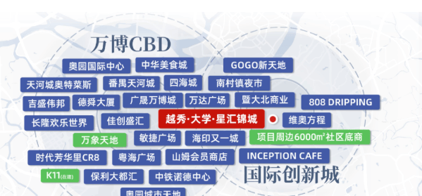 项目自带6000平方米的底商,虽缺乏大型商业设施,但可以通过前往附近的万博商圈满足购物需求,那里有万达广场、天河城、华润、山姆等大型商业综合体,品类丰富,选择多样,能够满足全方位的购物需求。