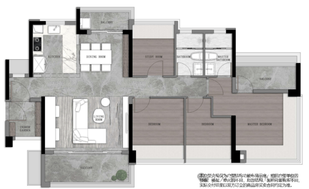 103㎡四房两卫:五开间约14米采光,开放式厨房,270°无立柱转角阳台,阳光梳妆台及衣帽间。
