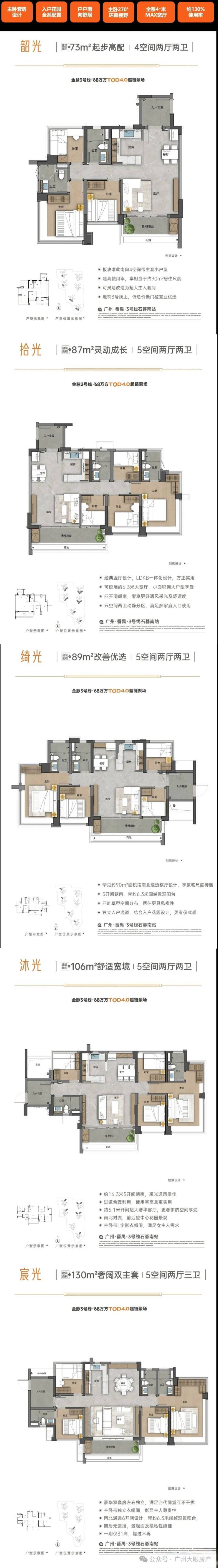 项目首推1栋和2栋,均为32层高,采用两梯五户设计;后续推出的3栋和4栋为42层高,三梯五户;而8栋和9栋则高达47层,同样采用三梯五户设计。主力户型包括73平方米、87-89平方米、109平方米和130平方米的四到五房,所有户型均具备高使用率、全南向、入户花园以及270°环幕飘窗等特点,极大地提升了居住体验。