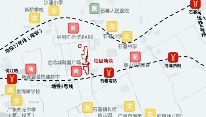 项目自带4000平方米商业,自建立体商业长廊(在建中),意向引入肯德基等知名品牌,集萃多元业态。北侧不到100米处即为金龙城财富广场,直线距离约1公里范围内还有中创汇·时光PARK和石碁人民医院等生活配套设施。依托3号线的开通,项目还能享受番禺广场商圈的辐射,龙湖天街等大型商业综合体也在建设之中。