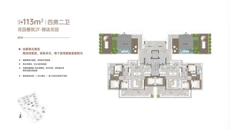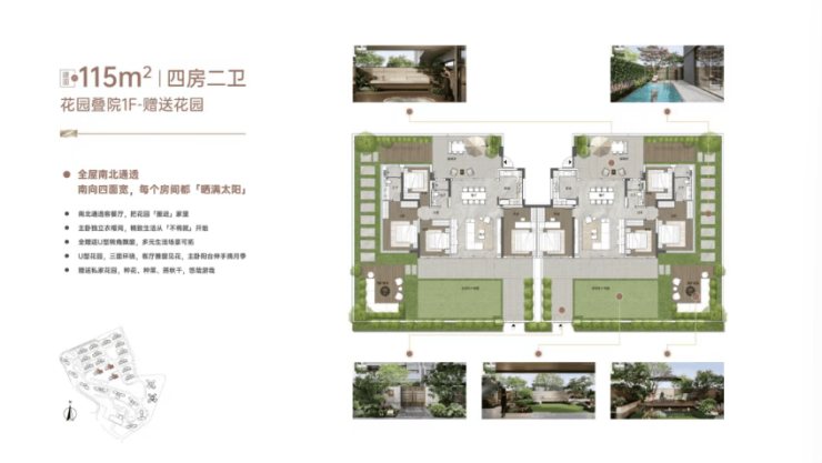 首层 115㎡四房两卫:送双花园(约 170㎡),前庭后院全赠送,使用率262%,相当于买 115㎡得 300㎡+ 超大花园,已基本售罄。