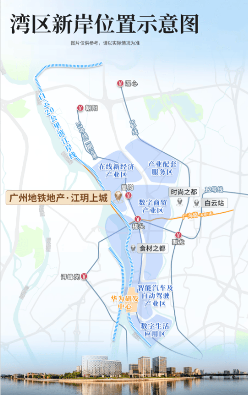 江玥上城踞守白云区槎头板块、珠江前航道西岸,隶属政府重点规划的 **“湾区新岸” 核心区 **,是继珠江新城、琶洲、白鹅潭之后,广州倾力打造的珠江第四个 “黄金十公里”,官方定位为 “下一个珠江新城”、广州迈向世界级滨水区的战略新核。