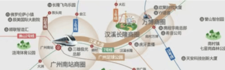 项目位于番禺区汉溪大道中,紧邻广州南站商圈与长隆-万博商圈两大国际级商圈。根据广州市规划,番禺区将打造“世界级文旅目的地”,项目周边3公里内汇聚广州南站、长隆度假区、万博CBD等核心资源,年均客流量超5000万人次,商业价值潜力巨大。