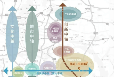 珠江未来城位于广州市番禺区,坐落于粤港澳大湾区的核心地带,具体处于广州第三中轴(亦称广州科创中轴)之上。项目紧邻广州国际创新城与番禺汽车城板块,是广州纵、横双中轴交汇的“黄金眼”,同时也是莲花湾片区广深科技创新走廊的重要节点。这里不仅是链接广州南北发展的战略支点,也是承接大学城科研成果转化的理想区域,为投资者和居民提供了一个充满潜力的生活与投资环境。