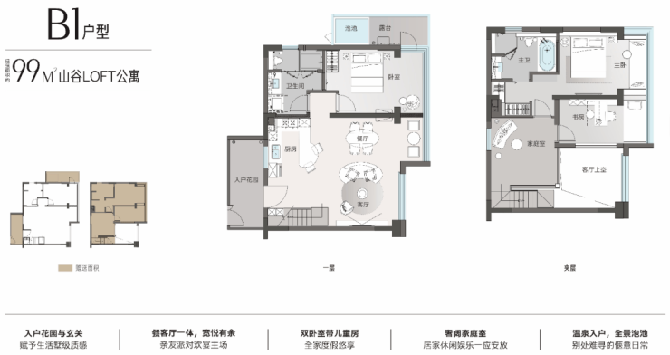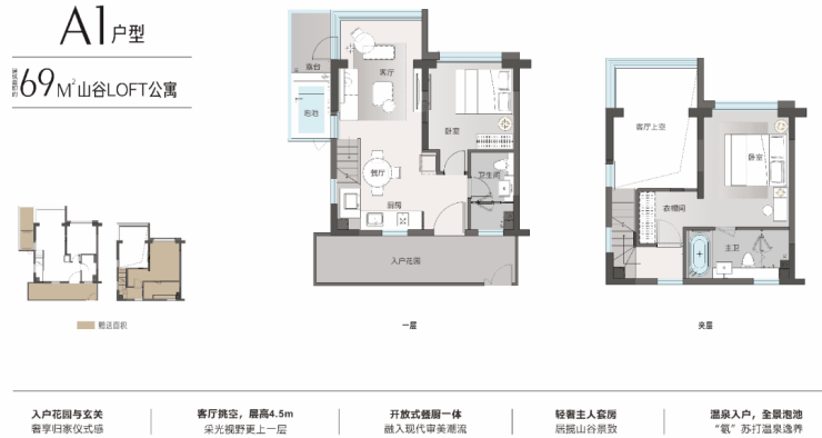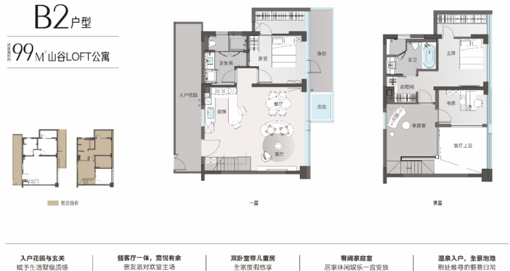 4.5 米层高,买一层送一层,大厅局部挑空,阳台赠送一半,入户花园全赠送,使用率超100%,全部温泉到户。